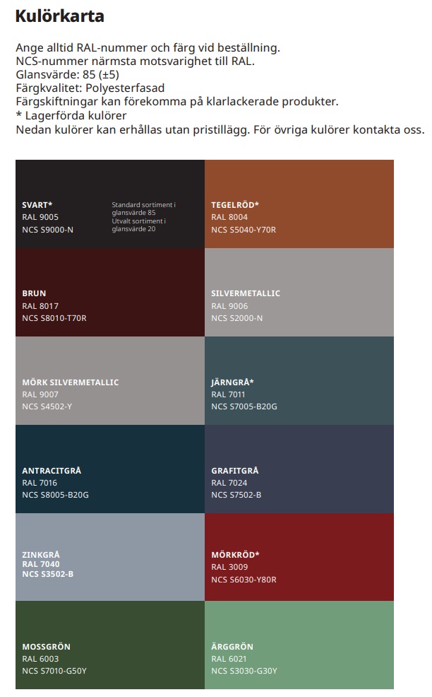 Tryckningsmetoden garanterar inte exakt återgivning. Samtliga kulörer finns i STD och EMK kvalitet. Aluminium är ett underhållsfritt material med stor motståndskraft även i aggressiv miljö. Material och ytbeläggning har stor.